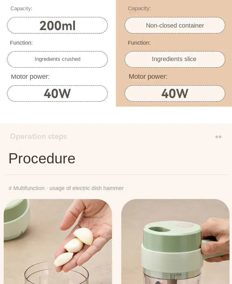 • 【Electric Vegetable Cutter Set】Mini Food Chopper can quickly chop food in seconds, wireless chopper is more convenient to cut and side dishes, fresh ingredients. Easily prepare a variety of ingredients to cook, save time and effort. Use it once and fall in love with it!